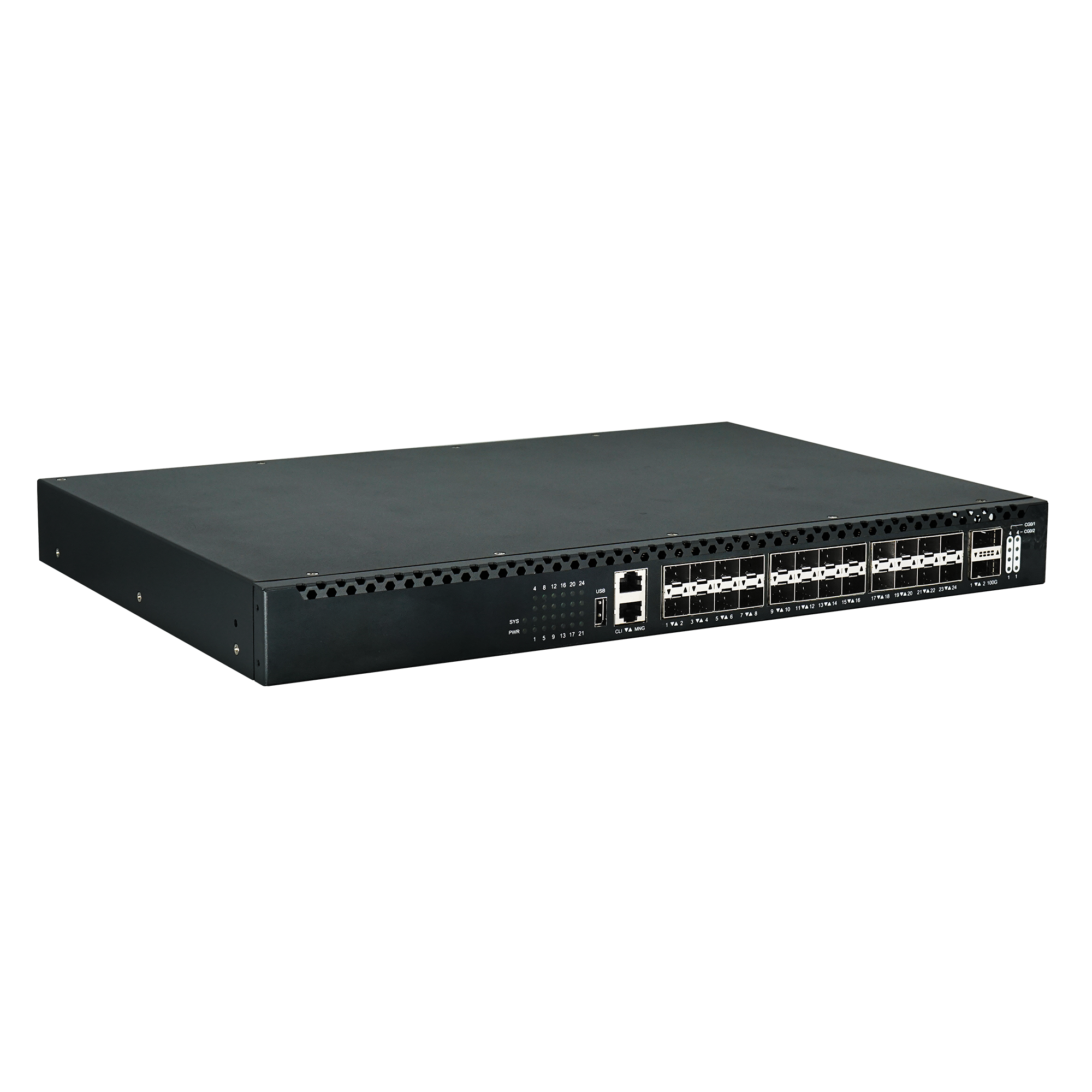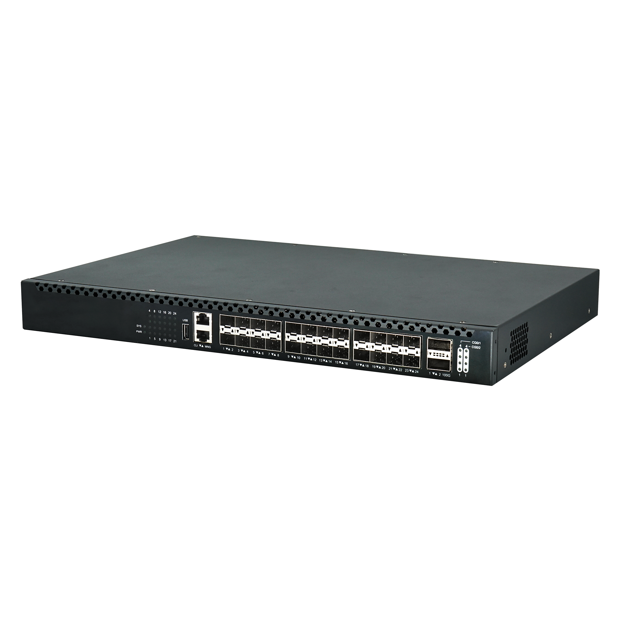 三层以太网路由交换机(1个CLI控制口,,,1个带外管理千兆电口,,,,1个USB2.0接口,,24个万/千兆SFP+光口,,4个100G/40G 光口(QSFP28封装,,,,可适应40G QSFP+或扩展成4个10GE);